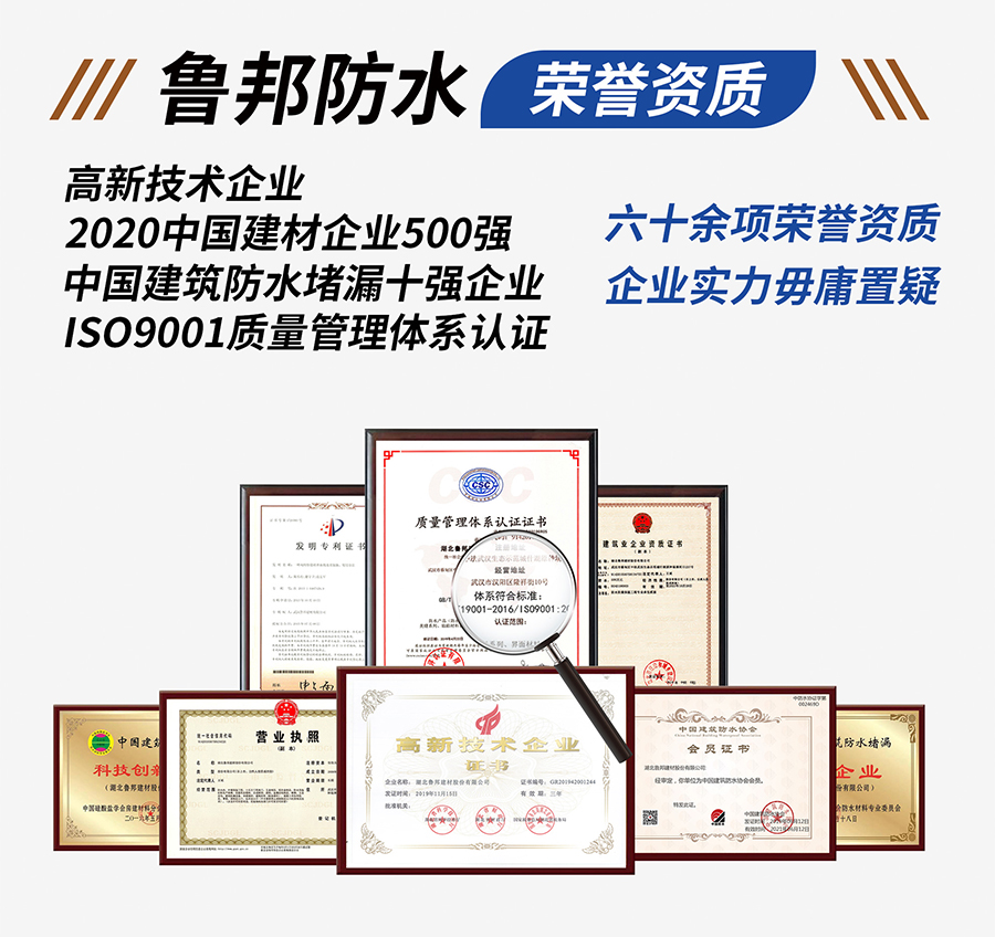 回首過往十三年,魯邦股份一步一個腳印,在防水事業(yè)上取得了令人矚目的成就。公司先后獲得“全國防水堵漏十強企業(yè)”,“中國建材企業(yè)500強”等榮譽稱號,同時公司成為高新技術(shù)企業(yè),擁有多項國家發(fā)明專利及新型實用專利。公司在全國擁有數(shù)千家專營店。公司的產(chǎn)品深受客戶肯定,服務也為客戶所稱道!